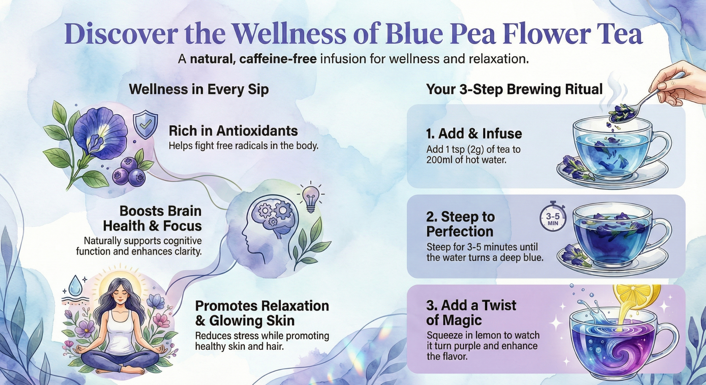 Add 1 teaspoon (2 g) of Blue Pea Flower Tea to 200 ml of hot water.