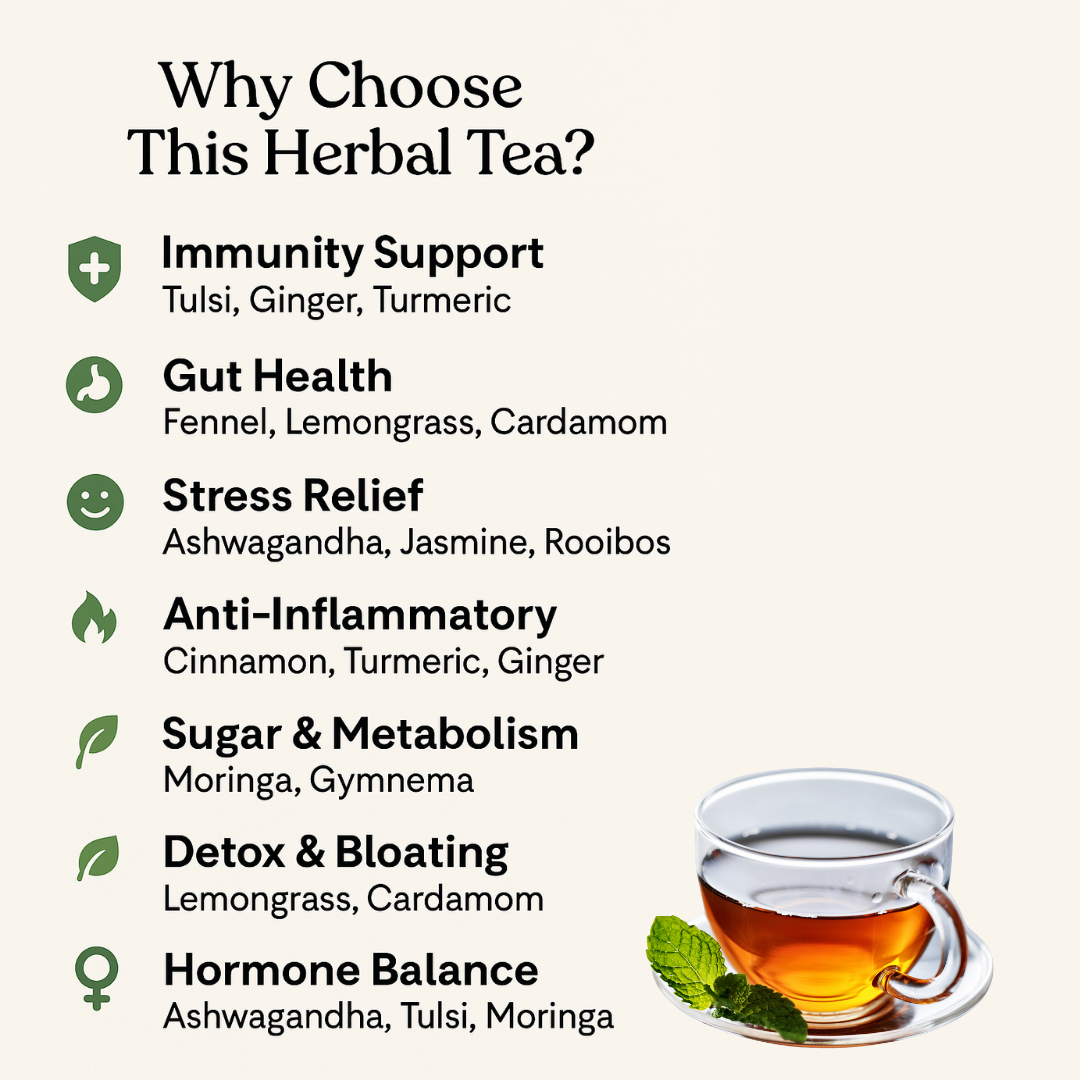 Ingredients: Mint, Tulsi,Cinammon,licit ice, rooibos,ginger, turmeric,ashvagandha, jasmine, moringa, gymnema sylvester, fennel, lemongrass, Pipli, cardamom