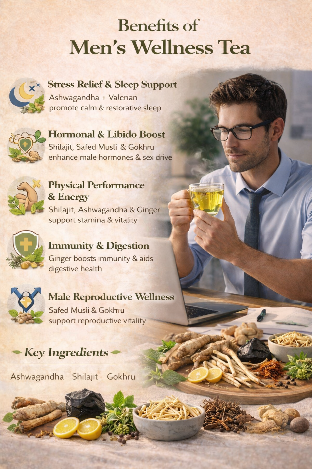 Infused with Ashwagandha, Shilajit, Gokhru, Safed Musli, Valerian Root, Ginger, and White Musli, this tea is your natural companion for sustained energy, calm focus, and masculine strength.